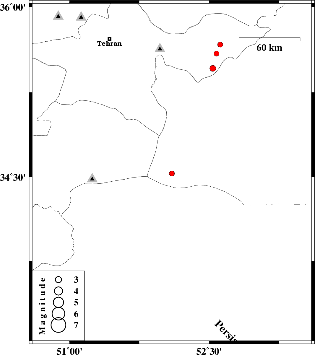2009/08/15 | 15:51:10.9 | 20:21:10.9 | 35.46 | 52.54 | 15 | ML3 | Tehran Province, 32 km North-East of Garmsar | ||