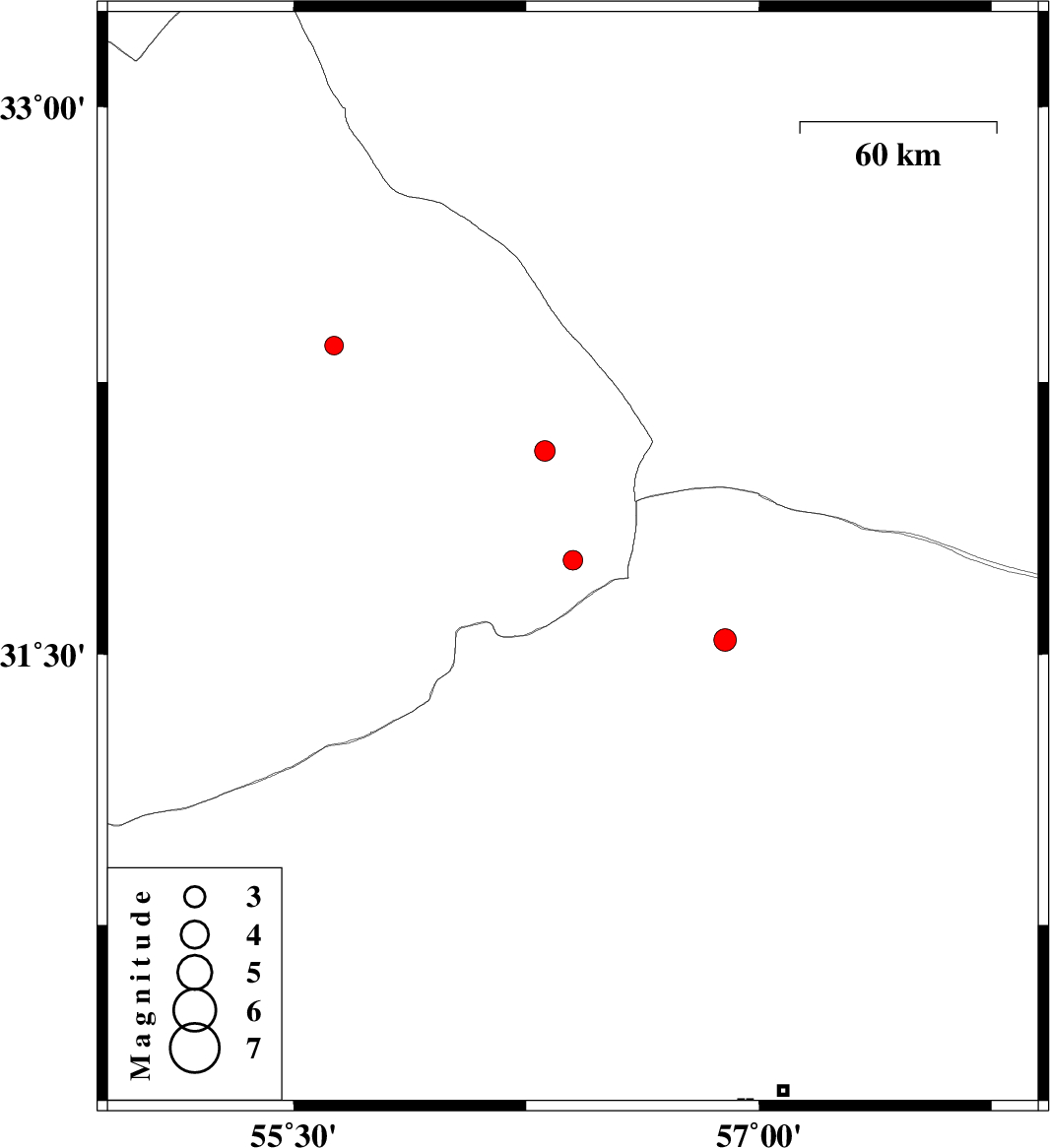 2009/08/09 | 16:22:59.7 | 20:52:59.7 | 31.54 | 56.89 | 18 | ML3.3 | Kerman Province, 31 km North of Ravar |