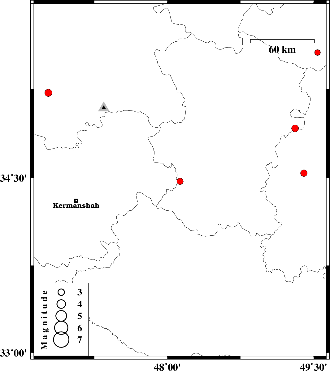 2009/08/30 | 09:13:16.0 | 13:43:16.0 | 34.47 | 48.13 | 43 | ML2.9 | Hamedan Province, 17 km East of Kangavar | ||