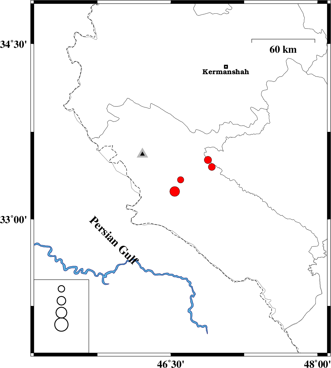 2009/08/30 | 14:04:37.4 | 18:34:37.4 | 33.24 | 46.54 | 14 | ML4.5 | Ilam Province, 37 km North-East of Mehran | ||