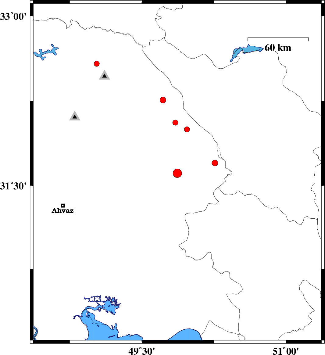 2009/08/13 | 06:12:44.6 | 10:42:44.6 | 31.61 | 49.87 | 15 | ML4.1 | Khoozestan Province, 11 km Bagh Malek | ||