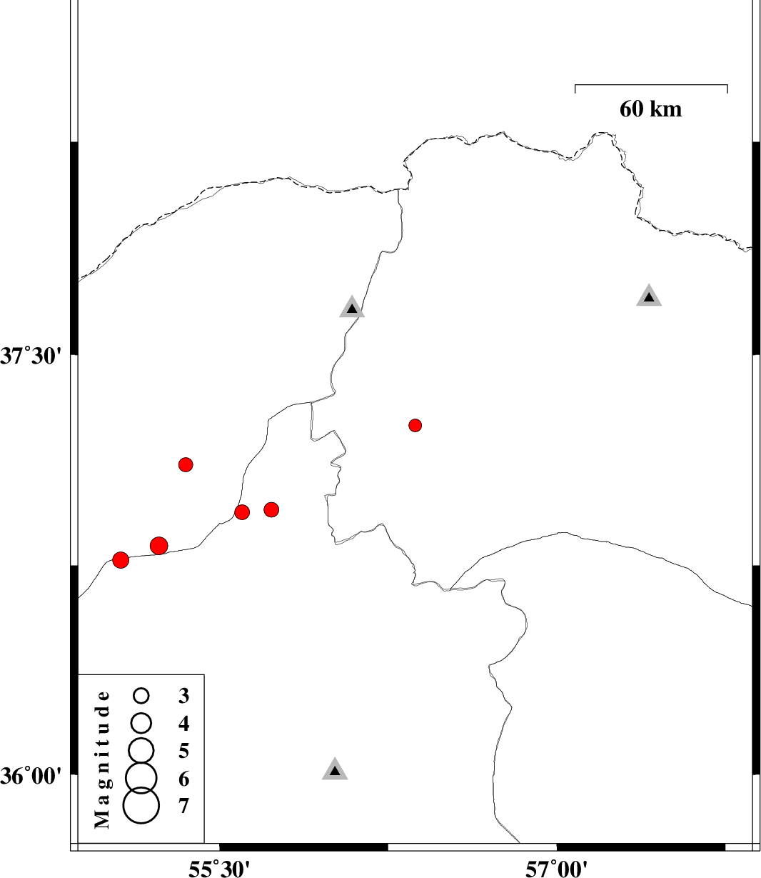 2009/08/13 04:59:32.1 09:29:32.1 37.1155.357 ML2.8 Golestan Province, 14 km South of Minodasht