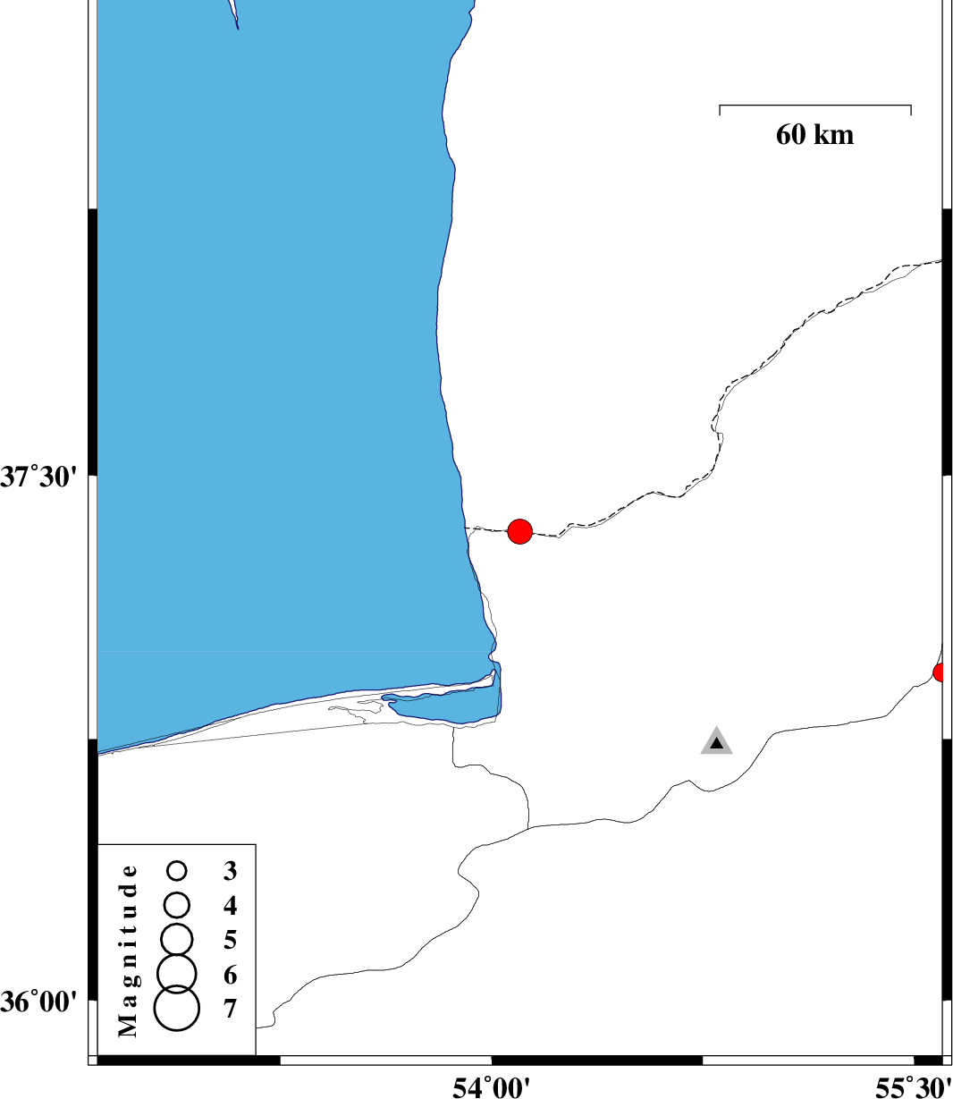 2009/08/23 | 18:51:21.2 | 23:21:21.2 | 37.34 | 54.1 | 14 | ML4 | 49 km North of Bandar-e torkaman | ||