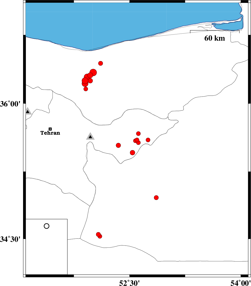 2009/08/15 | 04:10:54.2 | 08:40:54.2 | 36.16 | 51.91 | 6 | ML2.5 | Mazandaran Province, 47 km South-West of Nur | ||