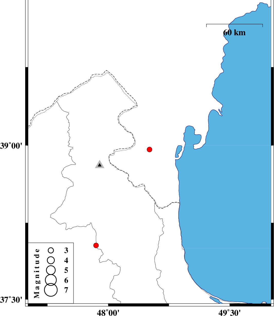 2009/08/06 | 01:41:52.4 | 06:11:52.4 | 38.03 | 47.85 | 15 | ML2.8 | Azarbaijan Sharghi Province, 24 km West of Nir |