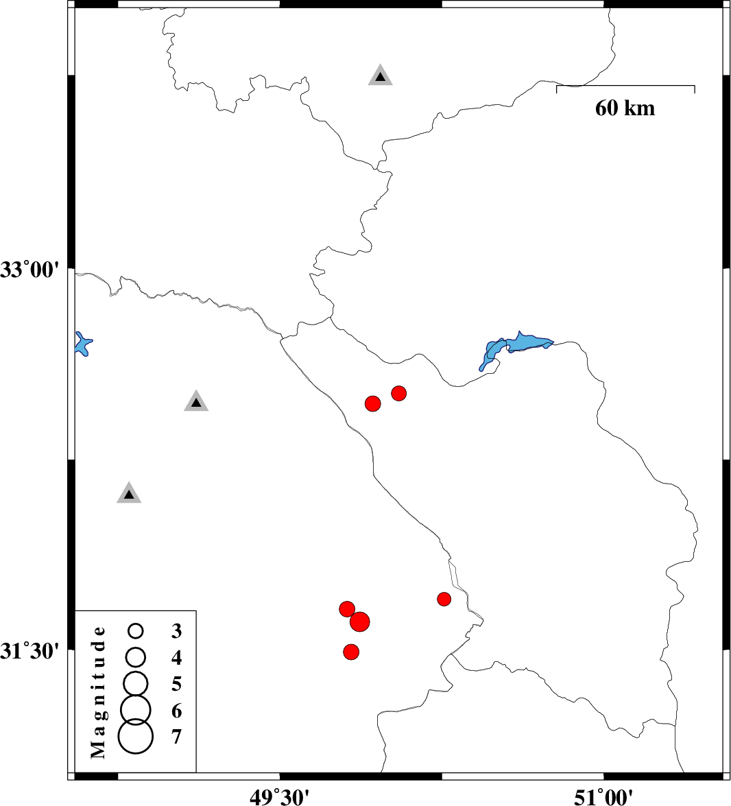 2009/08/12 | 01:02:34.2 | 05:32:34.2 | 31.7 | 50.26 | 14 | ML2.8 | Khoozestan Province, 39 km South-East of Izeh |