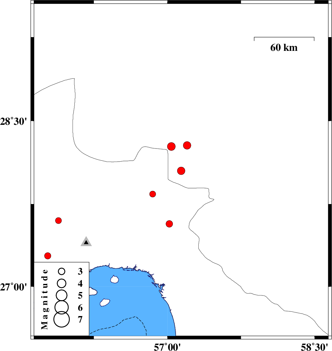 2009/08/22 | 19:17:18.9 | 23:47:18.9 | 28.28 | 57.2 | 14 | ML3.5 | Kerman Province, 60 km North-West of Kahnuj |