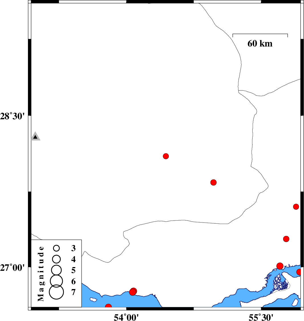 2009/09/08 | 08:26:50.4 | 12:56:50.4 | 26.6 | 53.8 | 46 | ML3.2 | Persian Gulf | ||