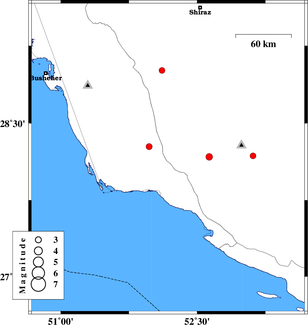 | 2010/03/27 | 00:48:01.8 | 05:18:01.8 | 28.07 | 53.32 | 43 | ML2.9 | Fars Province, 53 km South-West of Jahrom | ||