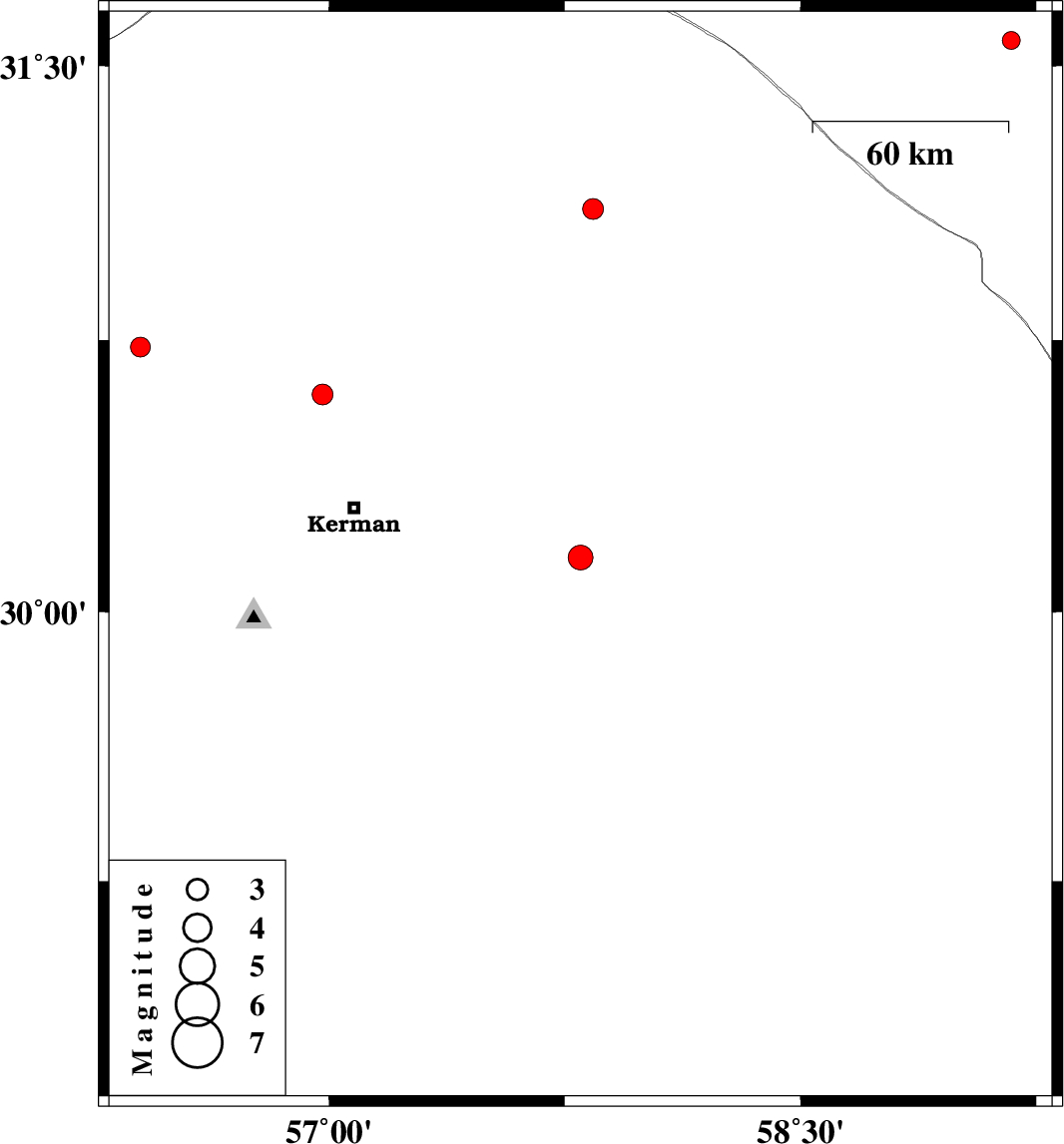 2009/09/10 | 08:06:39.7 | 12:36:39.7 | 31.11 | 57.84 | 18 | ML3 | Kerman Province, 99 km South-East of Ravar | ||
