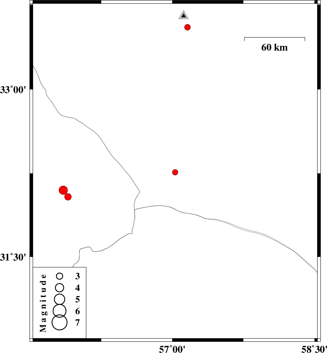 2009/09/30 | 00:12:01.1 | 03:42:01.1 | 32.04 | 55.9 | 15 | ML:3.3 | Yazd Province, 68 km North-East of Bafq | ||