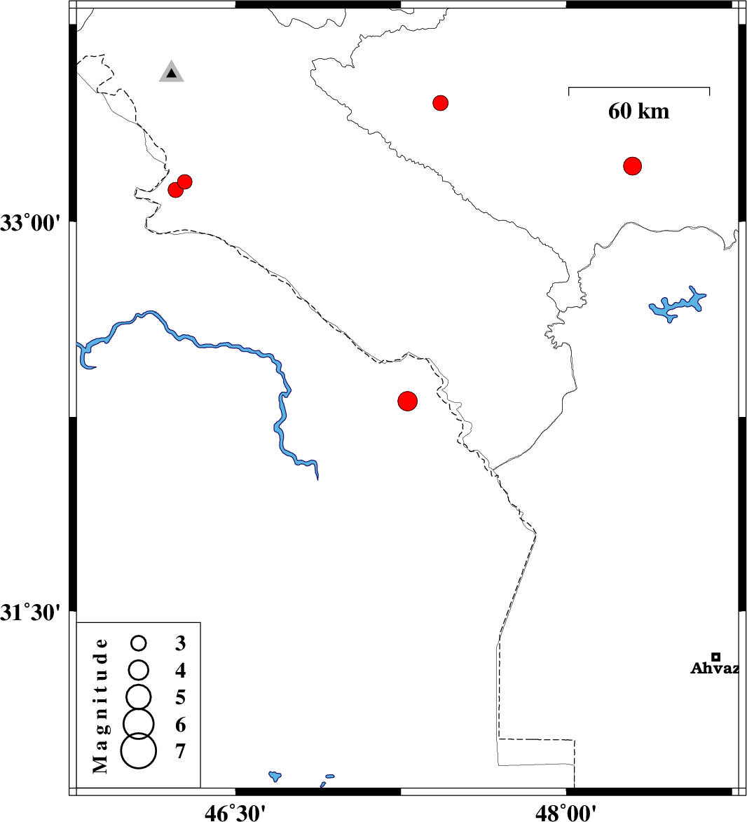 2009/09/25 | 06:10:02.6 | 09:40:02.6 | 33.15 | 46.27 | 14 | ML3 | Ilam Province, 11 km East of Mehran | ||