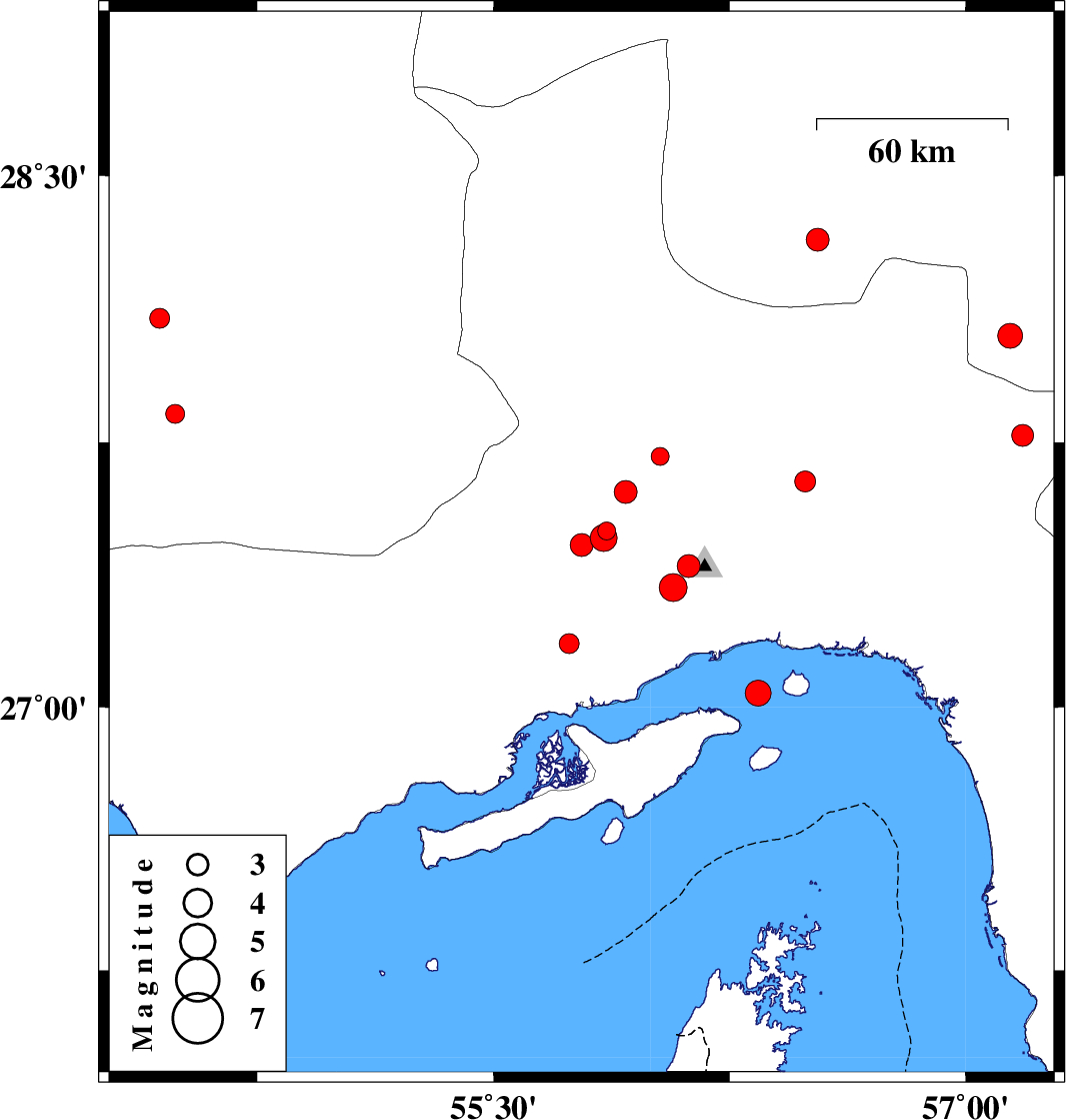 2009/09/29 | 05:08:03.7 | 08:38:03.7 | 27.04 | 56.34 | 16 | ML:3.7 | Persian Gulf, 12 km Qeshm | ||
