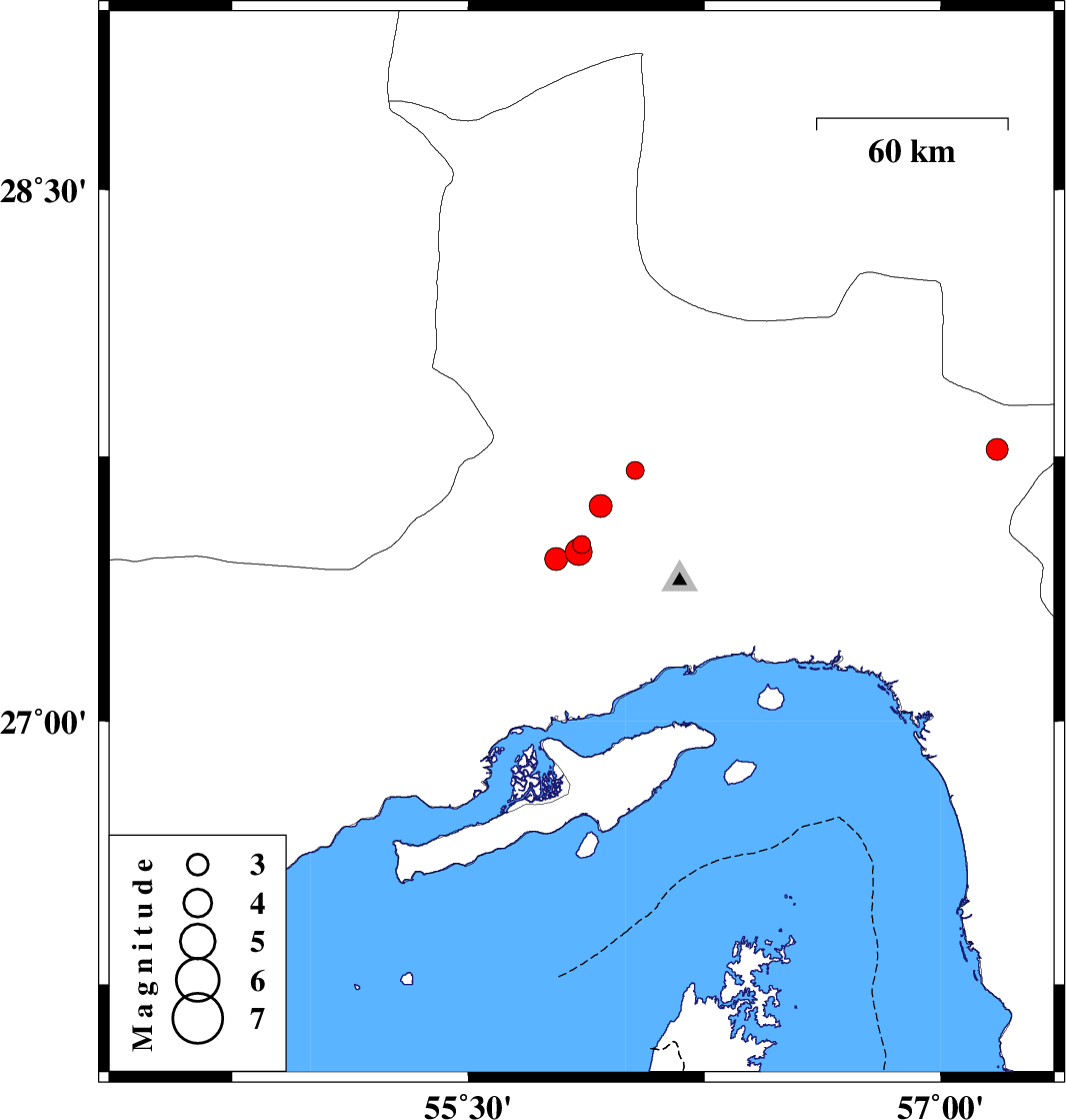 2009/10/10 | 01:28:09.9 | 04:58:09.9 | 27.48 | 55.85 | 18 | ML:3.8 | Hormozgan Province, 54 km North-West of Bandar-e abbas | ||