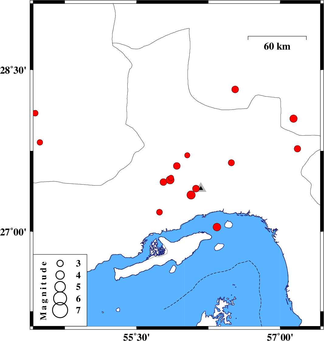 2009/09/15 | 14:44:10.4 | 19:14:10.4 | 28.05 | 57.14 | 27 | ML3.5 | Kerman Province, 55 km West of Kahnuj |