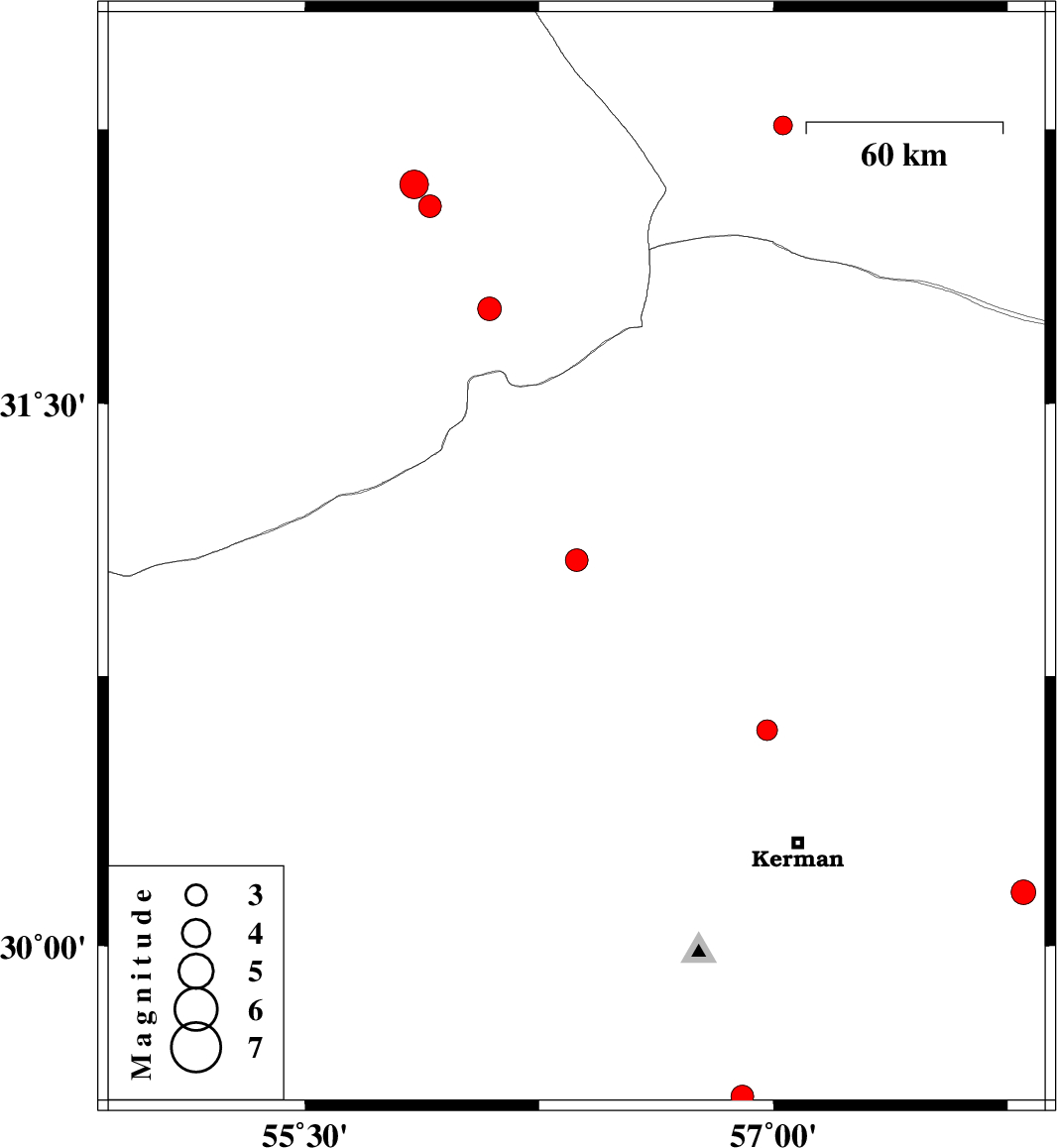 2009/09/29 | 21:37:52.5 | 01:07:52.5 | 30.6 | 56.98 | 14 | ML:2.9 | Kerman Province, 35 km North of Kerman | ||