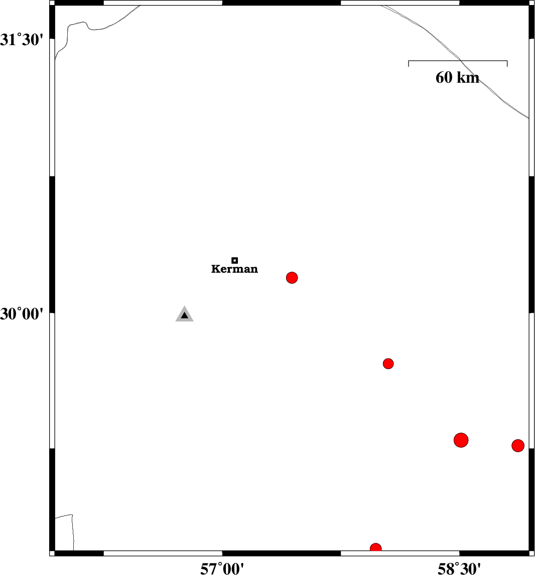 2009/09/29 | 21:37:52.5 | 01:07:52.5 | 30.6 | 56.98 | 14 | ML:2.9 | Kerman Province, 35 km North of Kerman |
