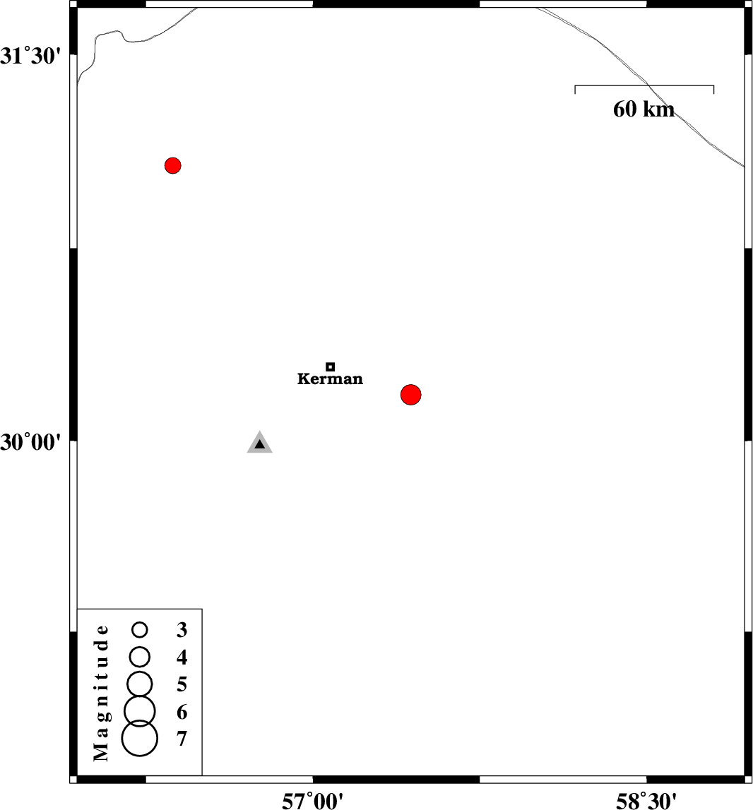2009/10/17 | 17:08:08.8 | 20:38:08.8 | 30.18 | 57.44 | 12 | ML:4.1 | Kerman Province, 36 km South-East of Kerman | ||