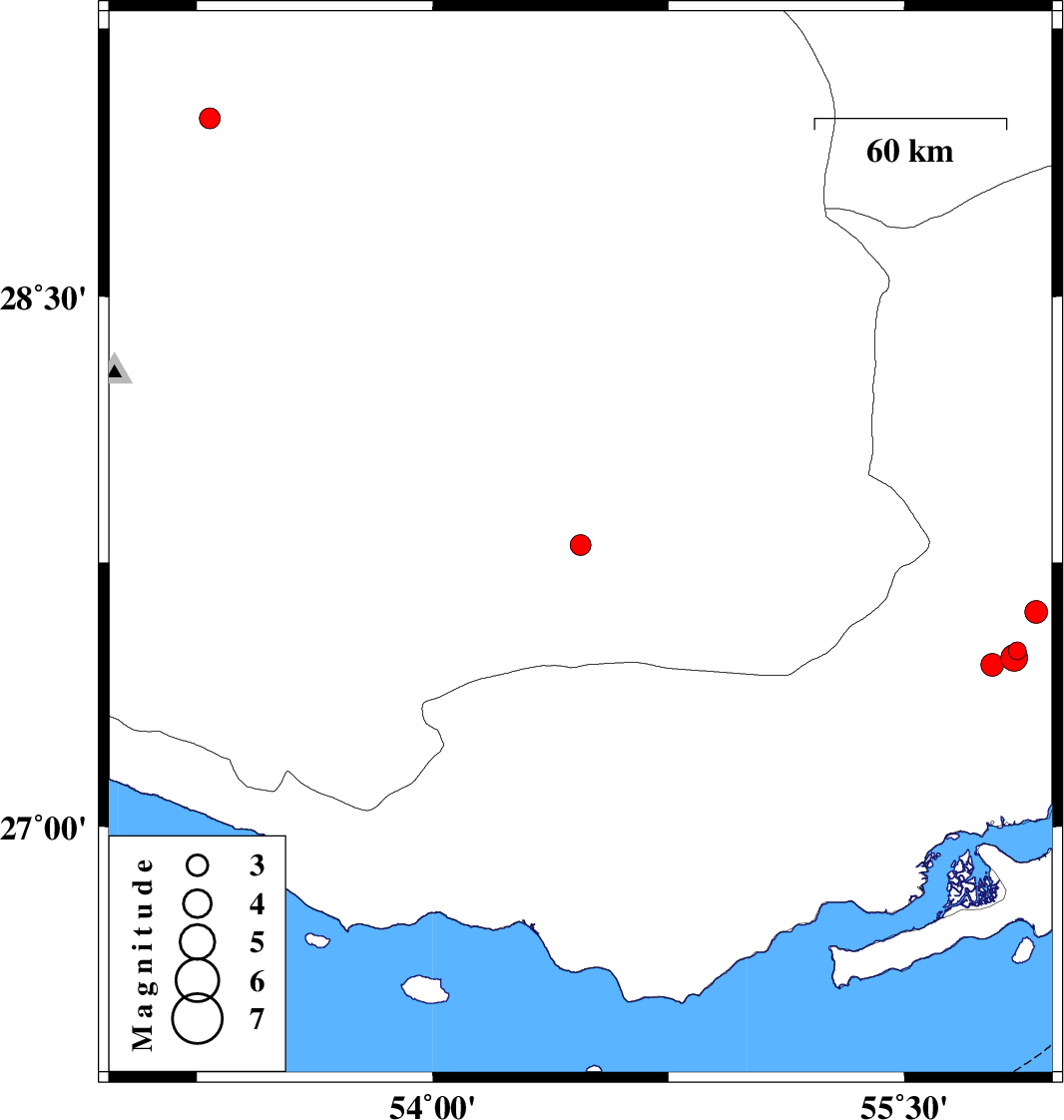 2009/10/10 | 01:28:09.9 | 04:58:09.9 | 27.48 | 55.85 | 18 | ML:3.8 | Hormozgan Province, 54 km North-West of Bandar-e abbas | ||