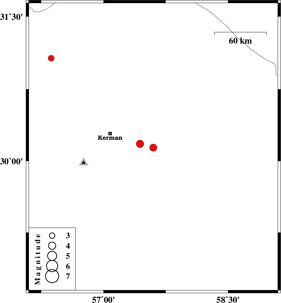 2009/10/21 | 01:44:37.5 | 05:14:37.5 | 30.14 | 57.6 | 15 | ML3.9 | Kerman Province, 53 km South-East of Kerman | ||