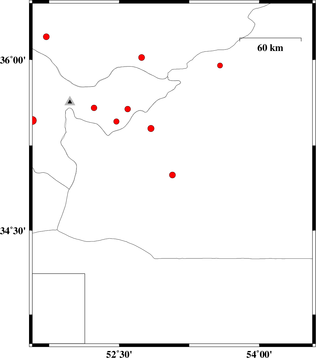 2009/10/18 | 04:07:35.1 | 07:37:35.1 | 35.58 | 52.23 | 12 | ML2.8 | Tehran Province, 20 km South-East of Damavand | ||