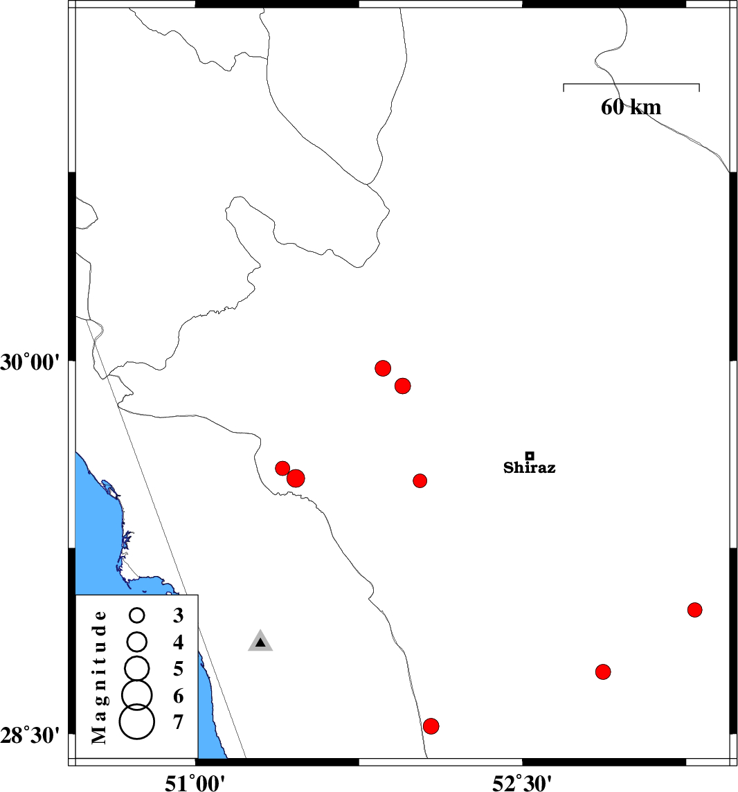 2009/09/28 | 23:27:05.6 | 02:57:05.6 | 29.57 | 51.4 | 18 | ML3 | Fars Province, 25 km West of Kazerun | ||
