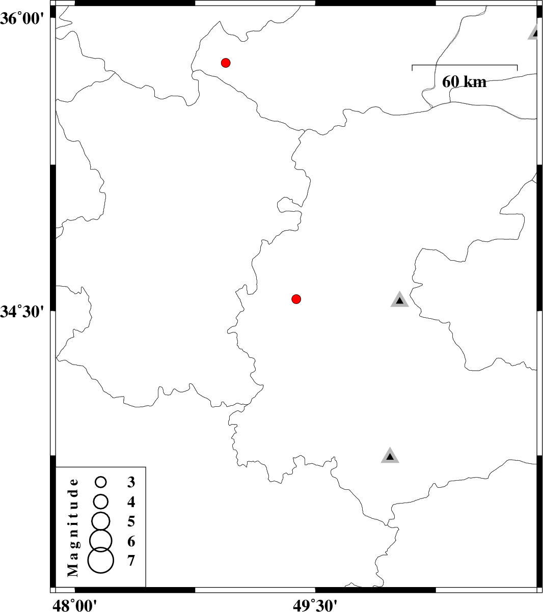 2009/10/12 | 15:38:31.6 | 19:08:31.6 | 35.77 | 48.94 | 15 | ML2.5 | Ghazvin Province, 44 km North of Razan |