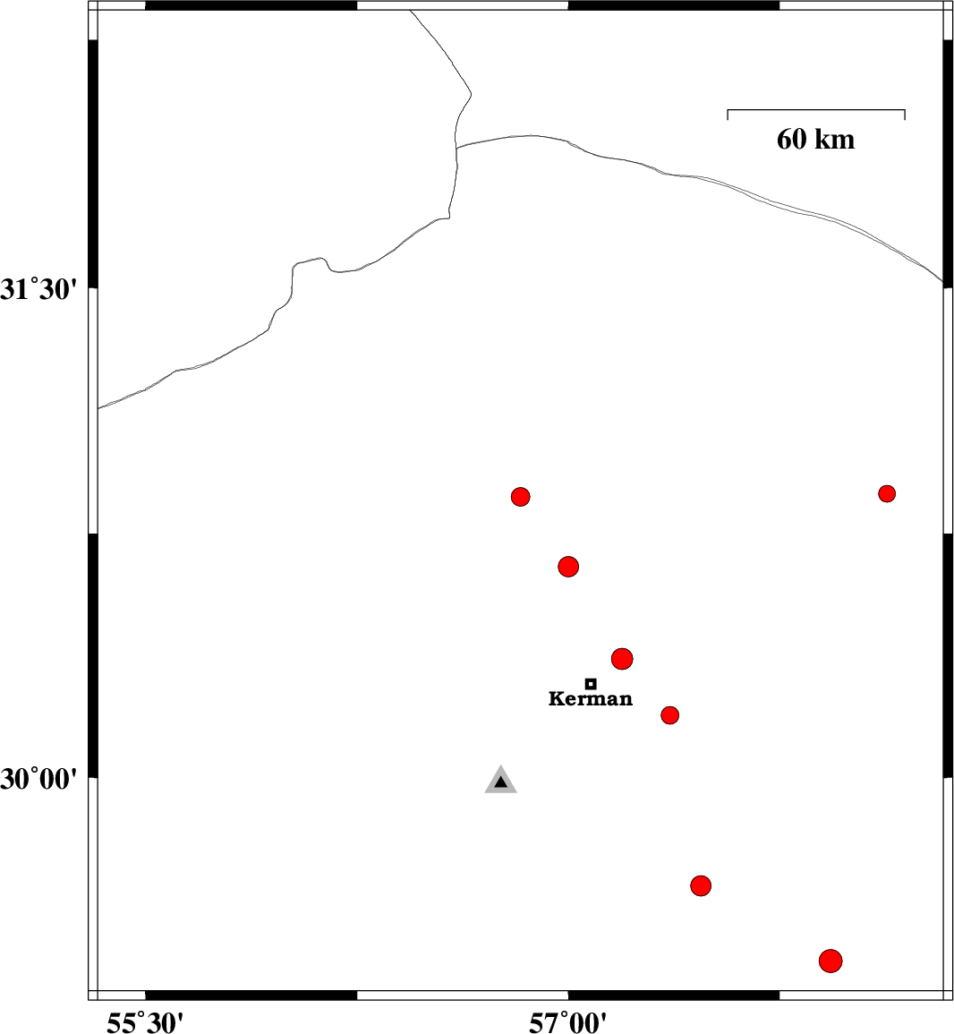 2009/10/21 | 01:44:37.5 | 05:14:37.5 | 30.14 | 57.6 | 15 | ML:3.9 | Kerman Province, 53 km South-East of Kerman | ||