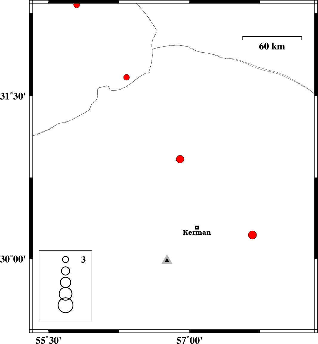 2009/10/21 | 01:44:37.5 | 05:14:37.5 | 30.14 | 57.6 | 15 | ML:3.9 | Kerman Province, 53 km South-East of Kerman |