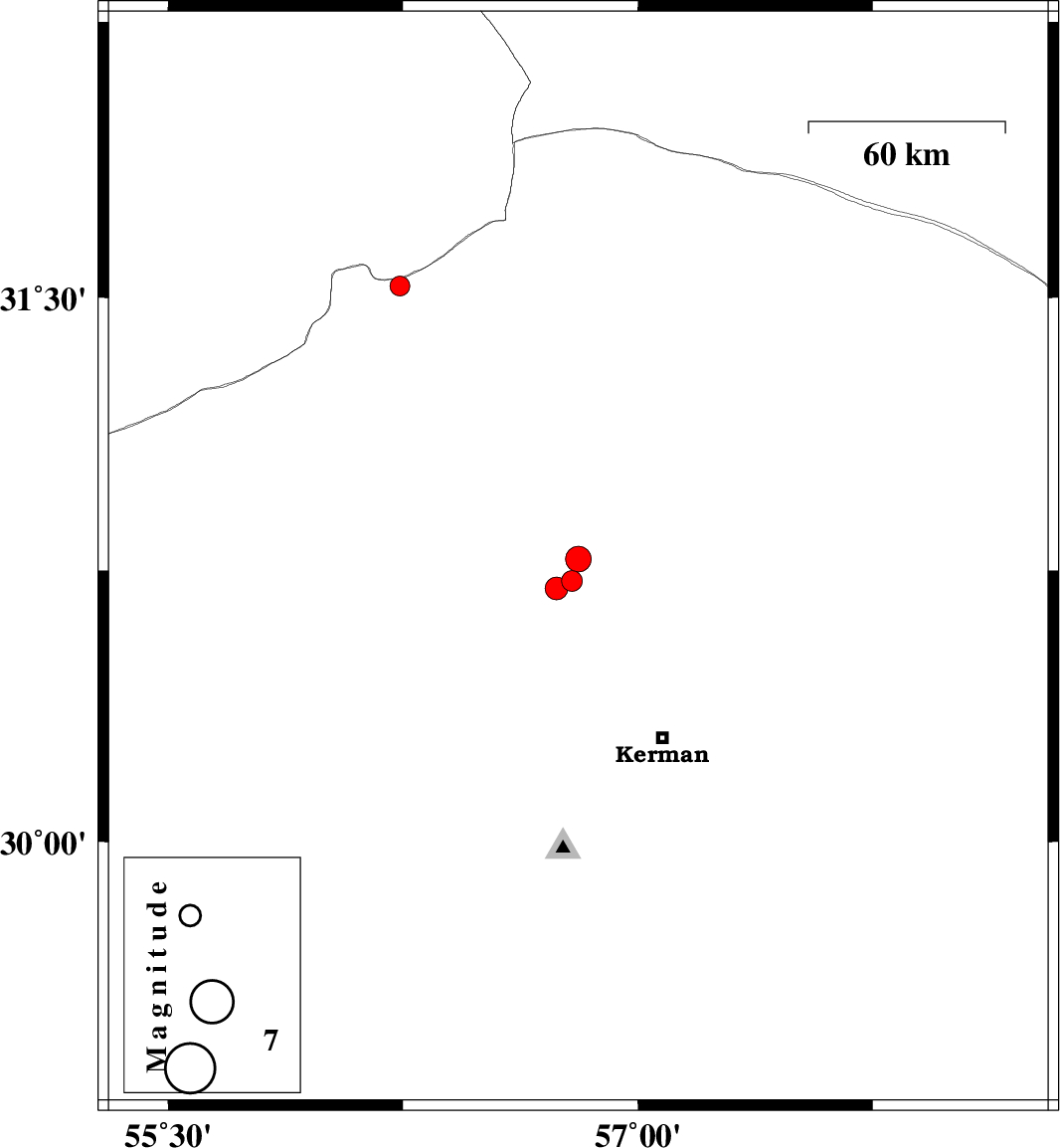 2009/10/31 | 17:45:07.6 | 21:15:07.6 | 30.78 | 56.81 | 14 | ML:2.9 | Kerman Province, 23 km East of Zarand | ||