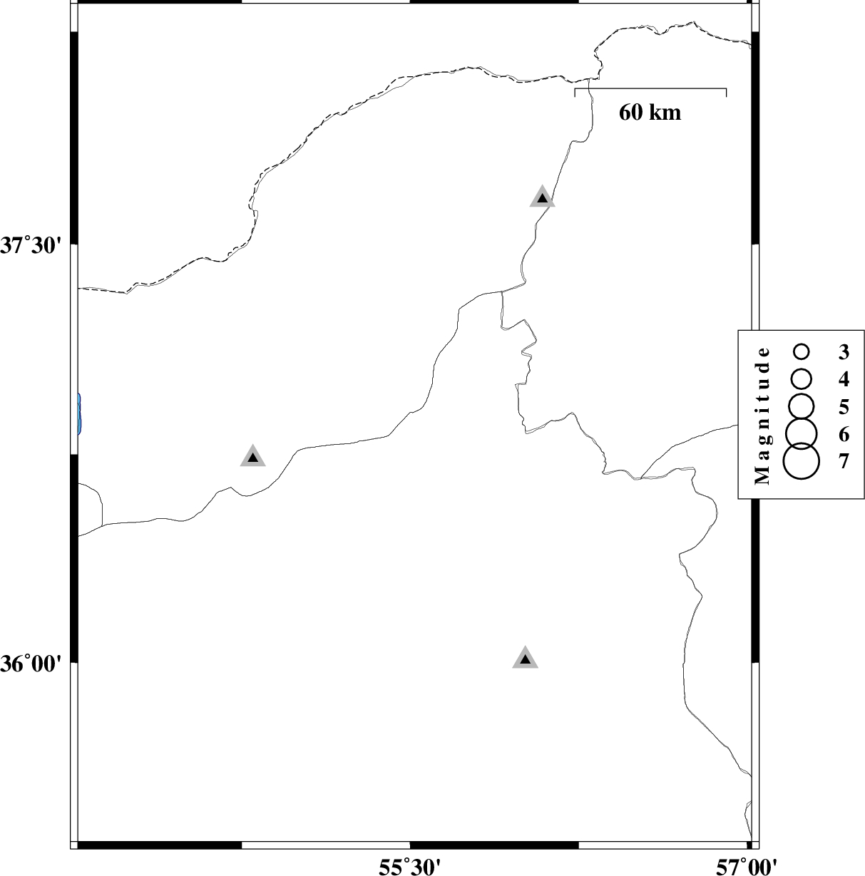 2009/09/29 | 06:52:34.1 | 10:22:34.1 | 36.86 | 55.49 | 6 | ML3.3 | Semnan Province, 42 km South-East of Minodasht | ||