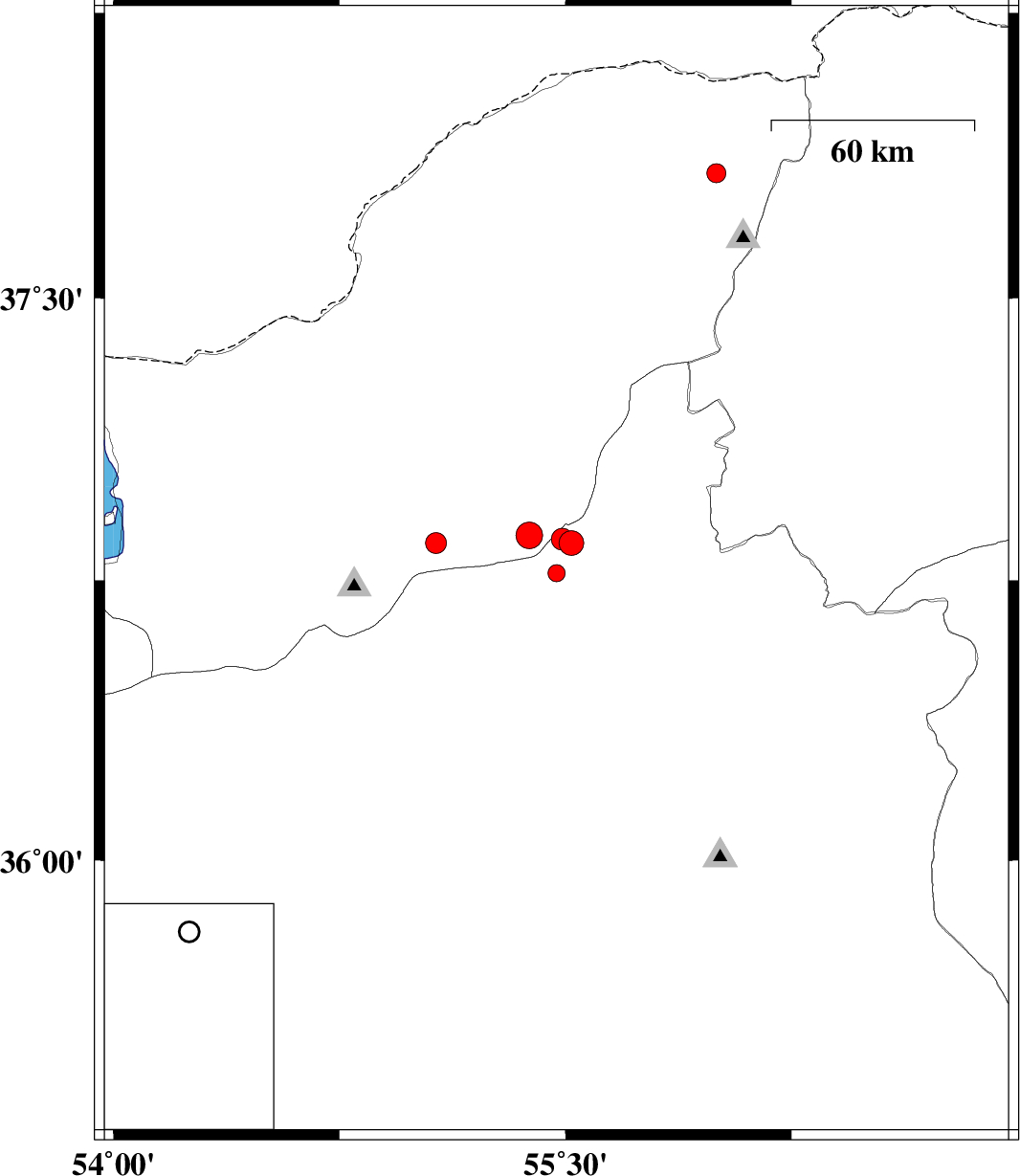 2009/09/29 | 06:52:34.1 | 10:22:34.1 | 36.86 | 55.49 | 6 | ML3.3 | Semnan Province, 42 km South-East of Minodasht | ||