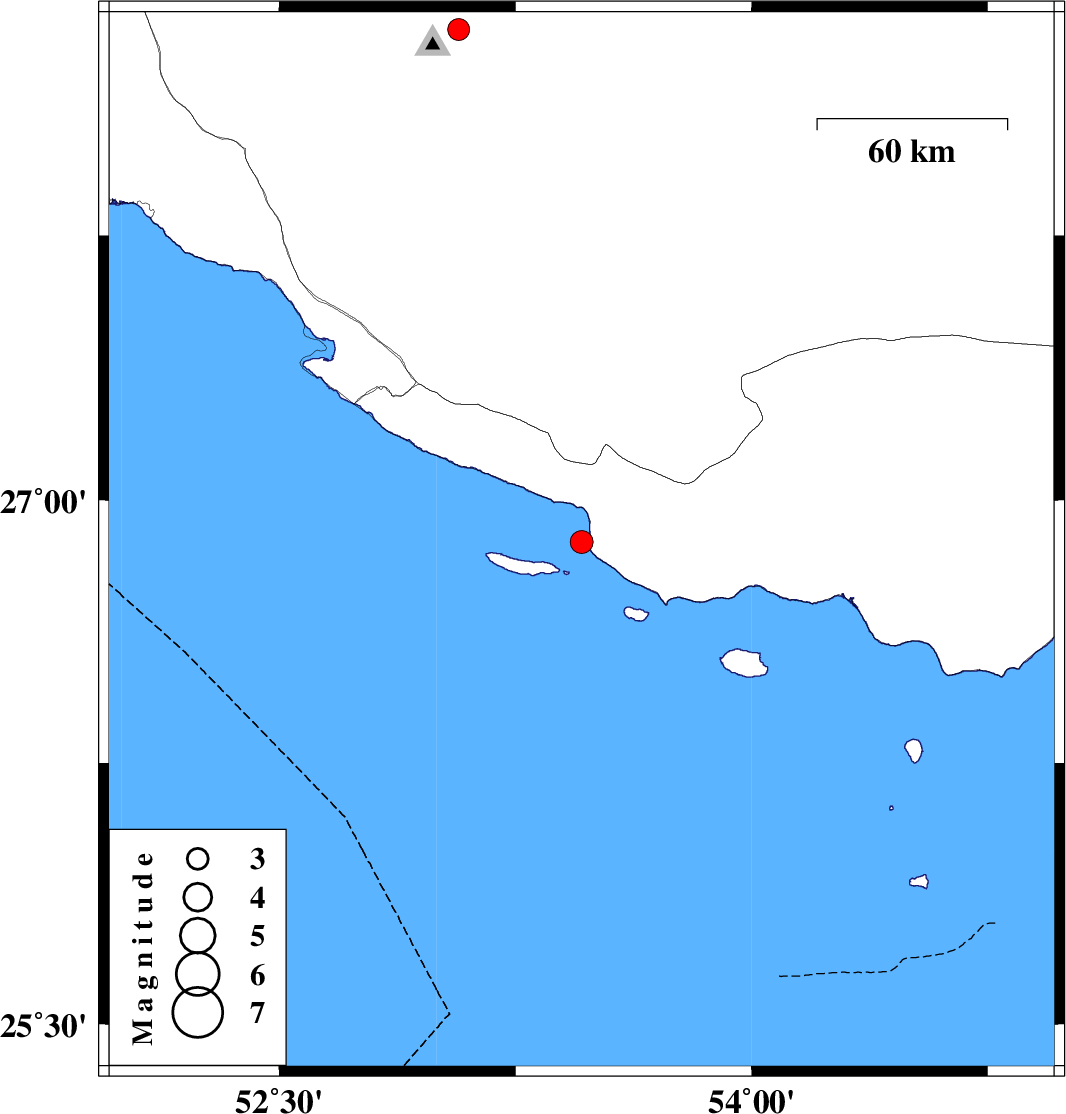 2009/11/18 | 06:35:58.4 | 10:05:58.4 | 26.88 | 53.46 | 36 | ML:3.2 | Persian Gulf, 58 km South-East of Lamerd | ||