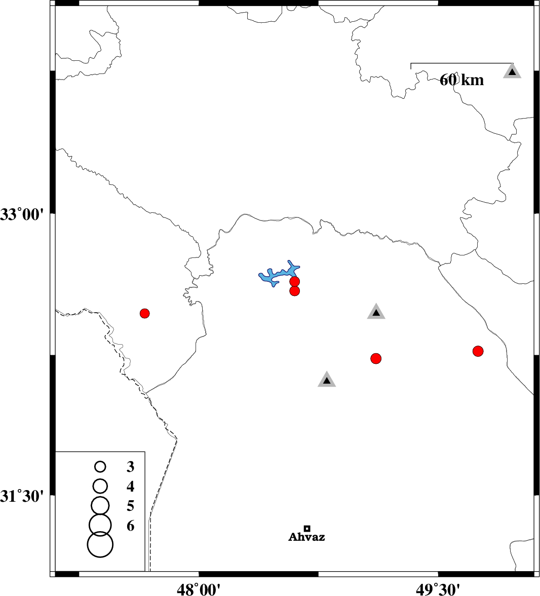 2009/11/19 | 12:24:33.6 | 15:54:33.6 | 32.59 | 48.6 | 17 | ML2.8 | Khoozestan Province, 27 km North-East of Andimeshk | ||