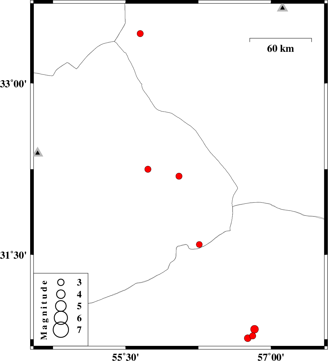 2009/10/31 | 17:45:07.6 | 21:15:07.6 | 30.78 | 56.81 | 14 | ML:2.9 | Kerman Province, 23 km East of Zarand | ||