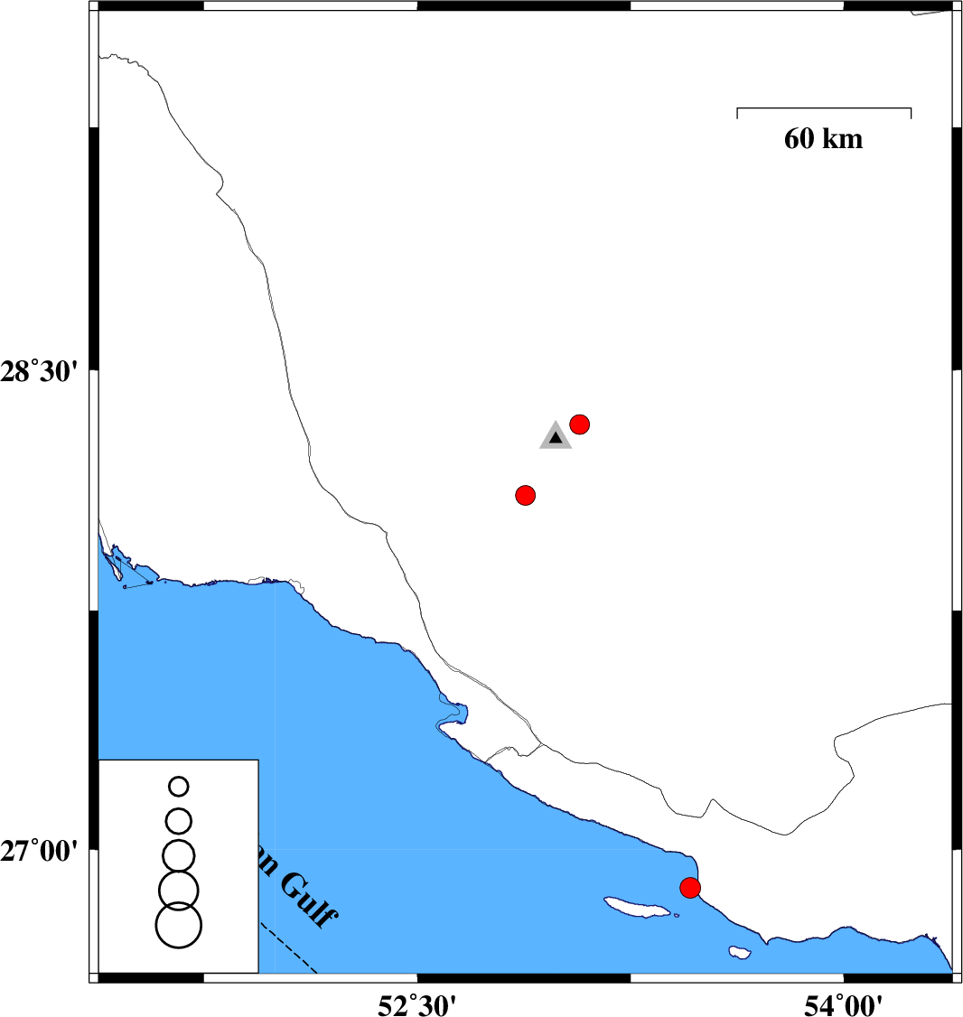 2009/11/18 | 06:35:58.4 | 10:05:58.4 | 26.88 | 53.46 | 36 | ML:3.2 | Persian Gulf, 58 km South-East of Lamerd | ||