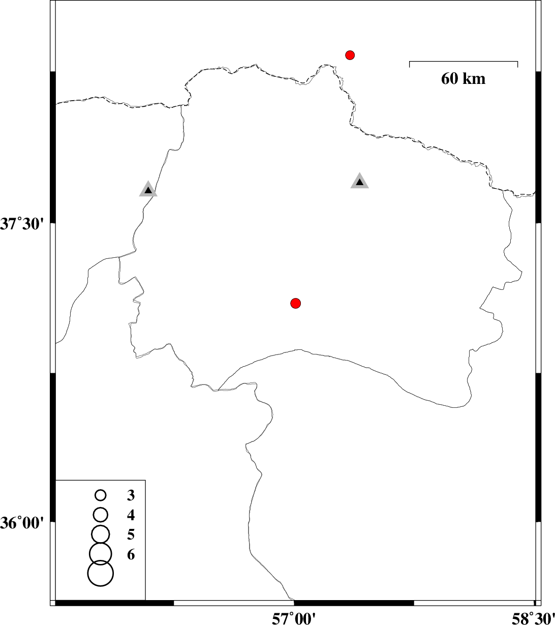 2009/11/29 | 11:38:26.1 | 15:08:26.1 | 37.1 | 57.01 | 24 | ML:2.8 | Khorasan(north) Province, 43 km West of Esfarayen | ||