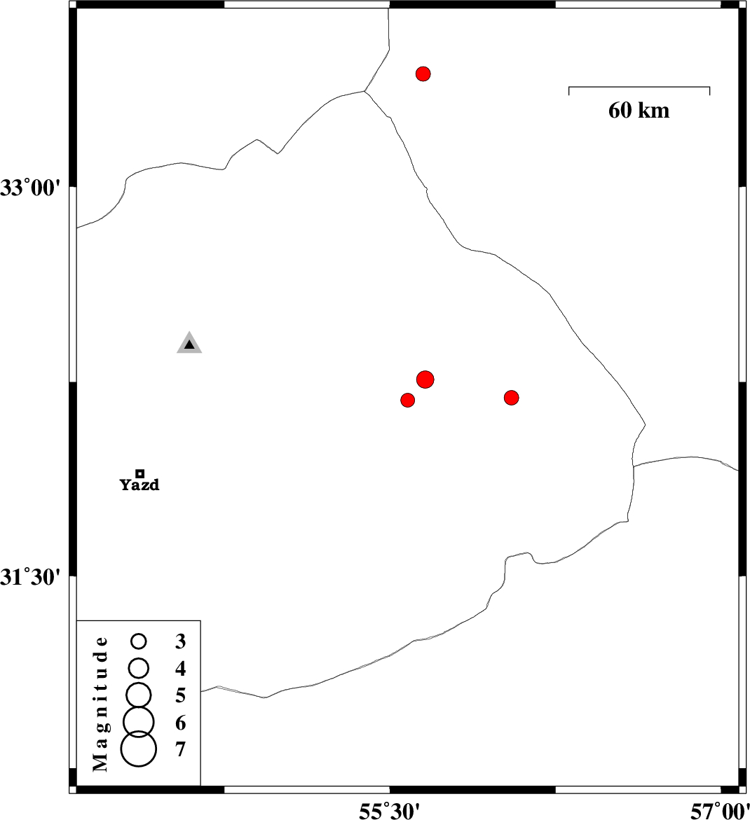 2009/11/21 | 19:06:35.4 | 22:36:35.4 | 32.19 | 56.05 | 14 | ML:2.9 | Yazd Province, 90 km North-East of Bafq | ||