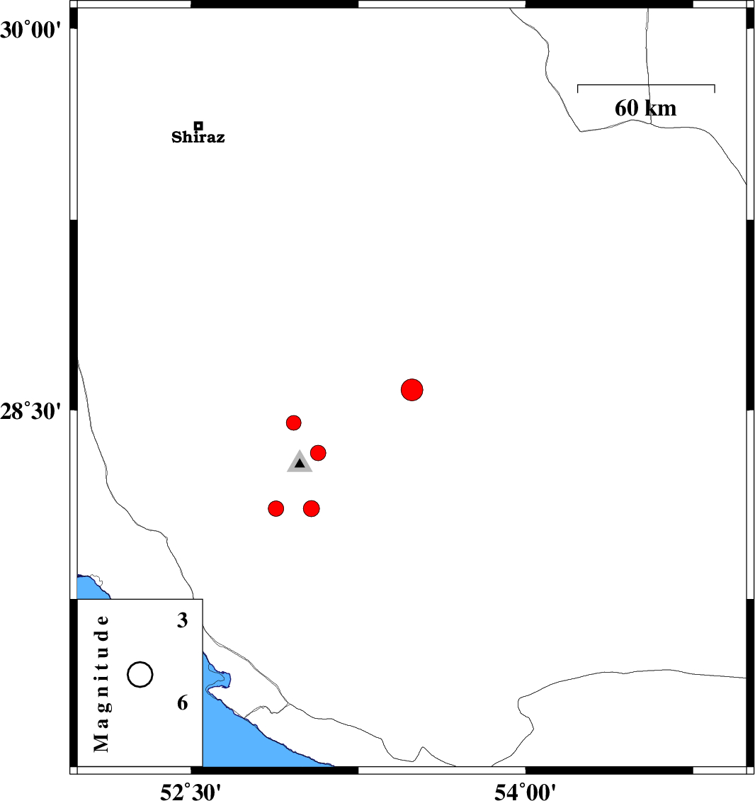 2009/11/02 | 19:52:44.8 | 23:22:44.8 | 28.45 | 52.96 | 14 | ML3 | Fars Province, 7 km Qir va Karzin |
