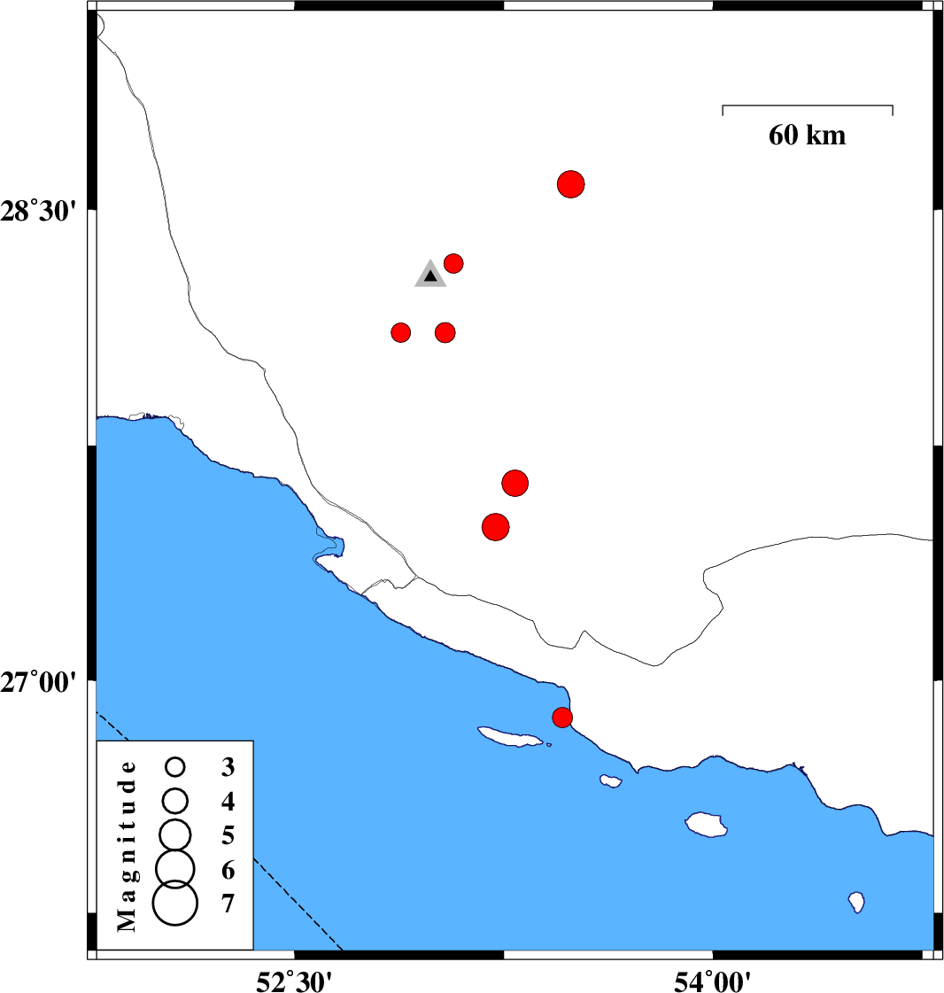 2009/11/18 | 06:35:58.4 | 10:05:58.4 | 26.88 | 53.46 | 36 | ML:3.2 | Persian Gulf, 58 km South-East of Lamerd | ||
