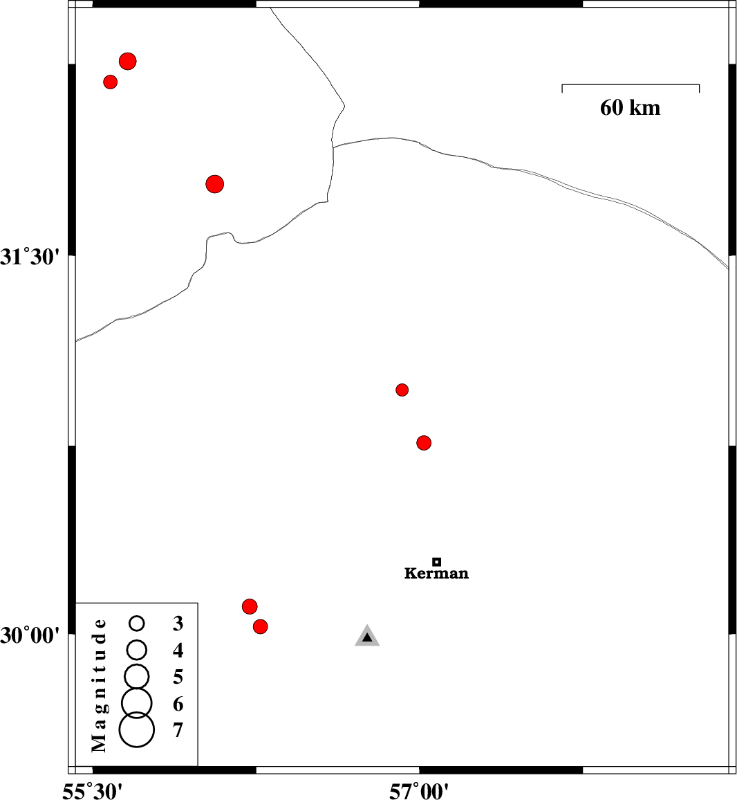 2009/12/07 | 04:59:46.2 | 08:29:46.2 | 30.76 | 57.02 | 18 | ML:2.9 | Kerman Province, 44 km East of Zarand | ||