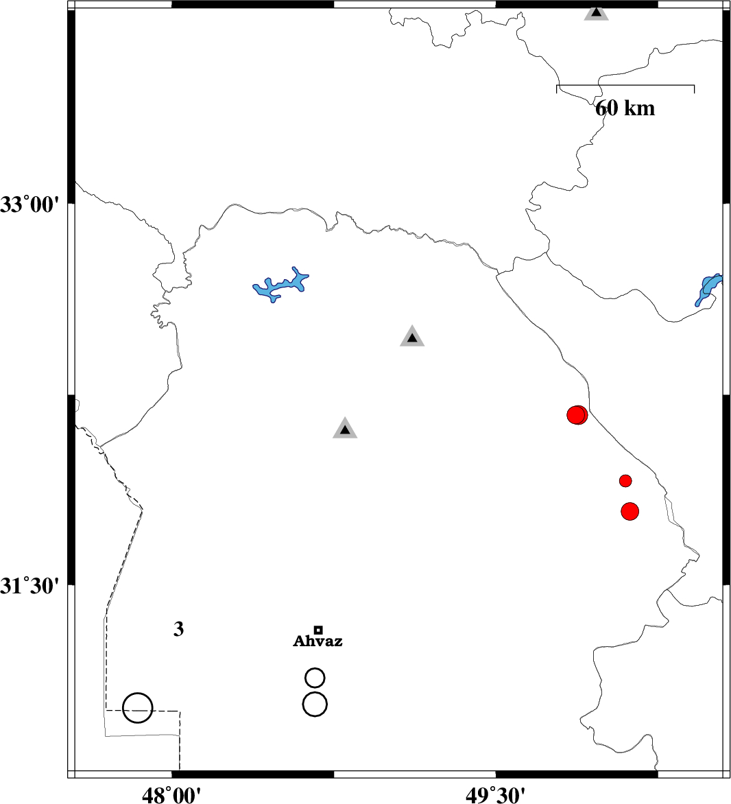 2009/12/25 | 06:37:59.0 | 10:07:59.0 | 32.26 | 49.05 | 15 | ML3.9 | Khoozestan Province, 15 km South of Lali | ||