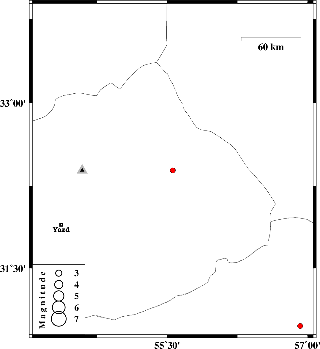 2009/12/25 | 10:18:56.5 | 13:48:56.5 | 32.39 | 55.56 | 14 | ML:2.5 | Yazd Province, 89 km North-East of Bafq | ||