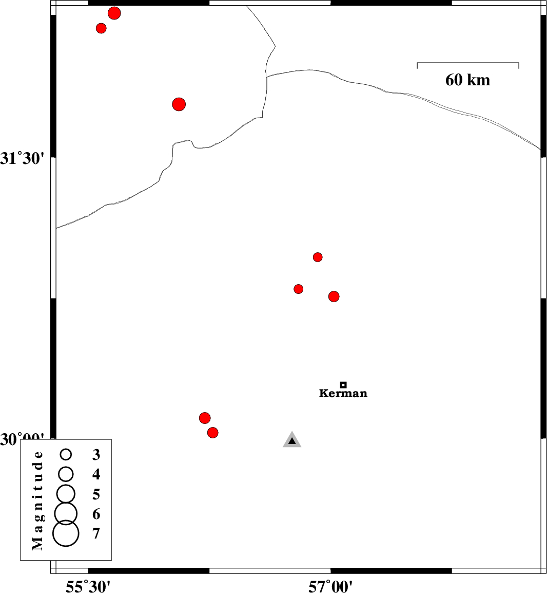 2009/12/07 | 04:59:46.2 | 08:29:46.2 | 30.76 | 57.02 | 18 | ML:2.9 | Kerman Province, 44 km East of Zarand | ||