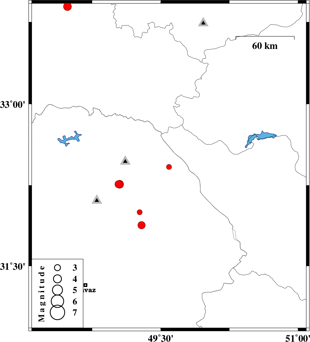 2009/12/26 | 05:50:21.9 | 09:20:21.9 | 32.42 | 49.59 | 42 | ML2.5 | Khoozestan Province, 46 km East of Lali | ||