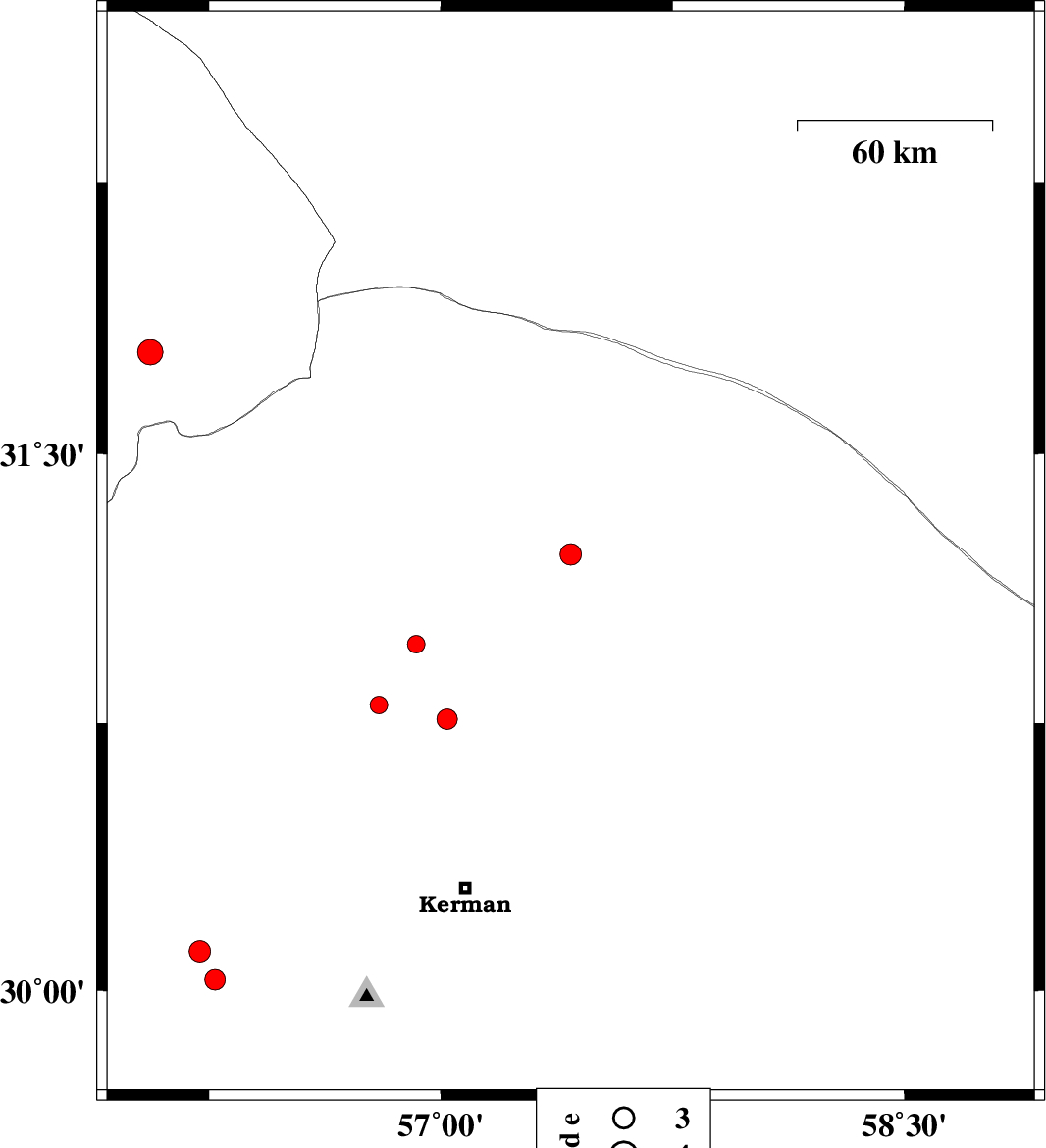 2009/12/07 | 04:59:46.2 | 08:29:46.2 | 30.76 | 57.02 | 18 | ML:2.9 | Kerman Province, 44 km East of Zarand |