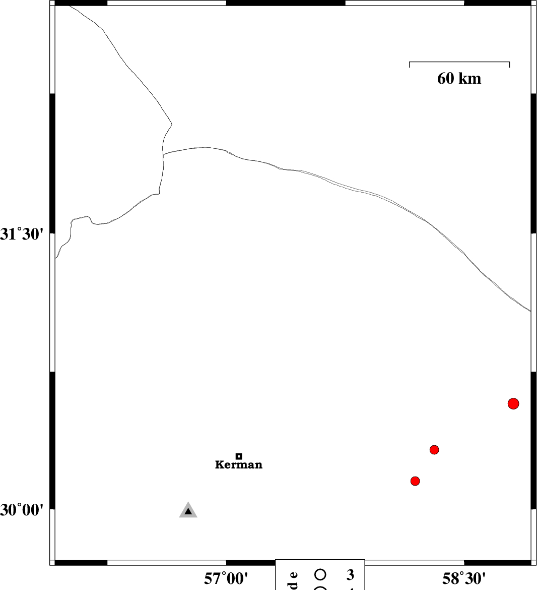 2009/12/27 | 11:01:47.2 | 14:31:47.2 | 31.22 | 57.42 | 14 | ML:3.1 | Kerman Province, 58 km East of Ravar | ||