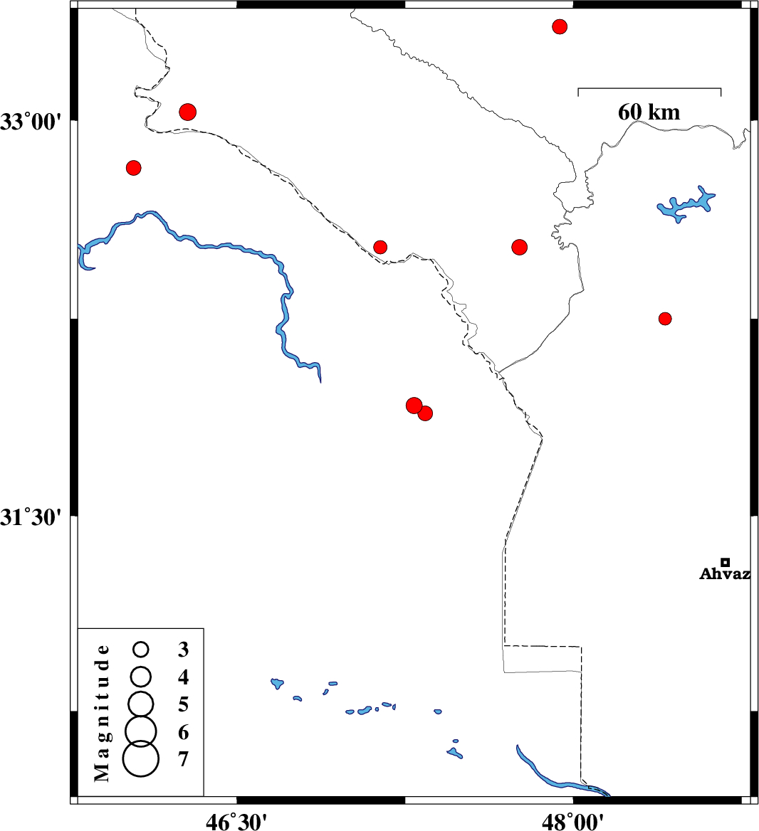 2009/12/07 | 21:34:27.6 | 01:04:27.6 | 33.03 | 46.28 | 15 | ML3.4 | Ilam Province, 15 km East of Mehran | ||