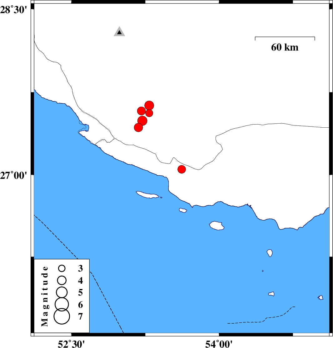 2009/12/12 | 01:58:34.5 | 05:28:34.5 | 27.63 | 53.29 | 26 | ML:4.2 | Fars Province, 35 km North-East of Lamerd |