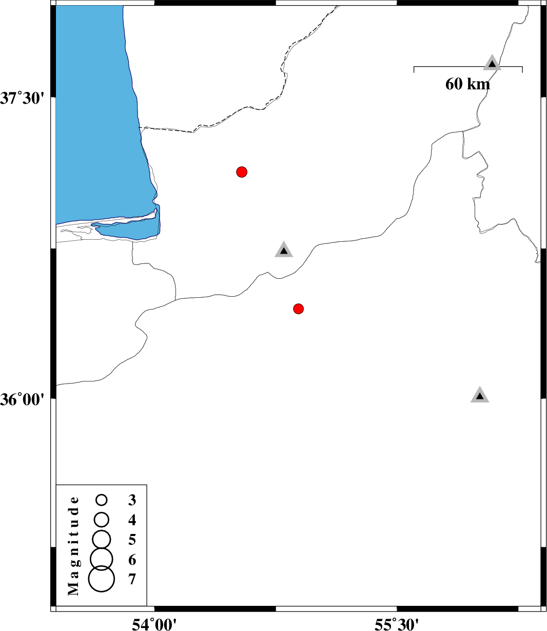 2009/11/18 | 17:57:14.2 | 21:27:14.2 | 37.13 | 54.54 | 15 | ML3 | Golestan Province, 15 km North of Aq Qaleh |